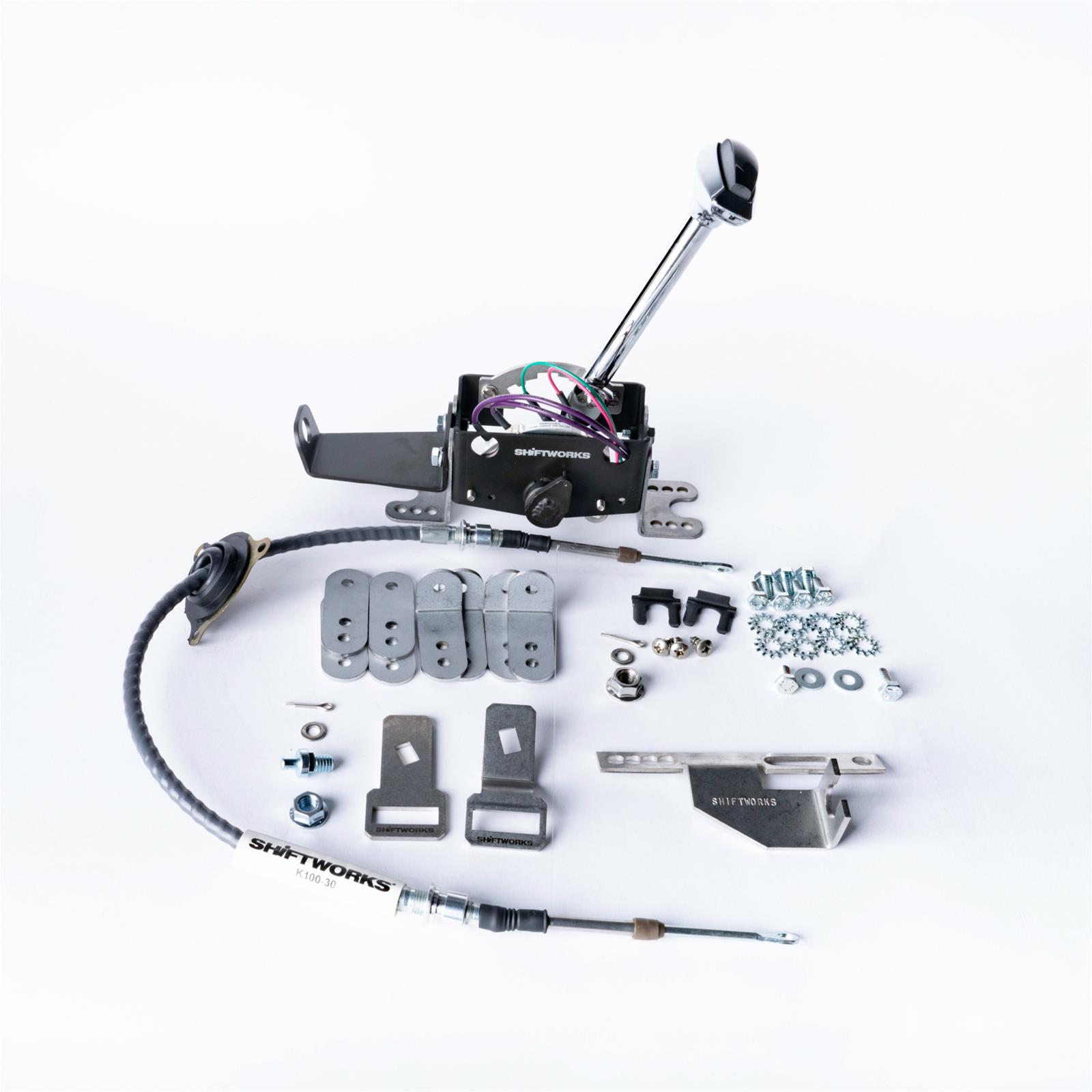 Shiftworks SW280 and SW230 Series automatic transmission floor mount shifters are adaptable to many different applications. They come with the mounting hardware, rod linkage, neutral safety/backup light switch, cables (where applicable) and the handle (in your choice of a T-handle style or round smoothie shift knob). For cable-operated setups, cable is also sold separately in various lengths to suit your vehicle needs.